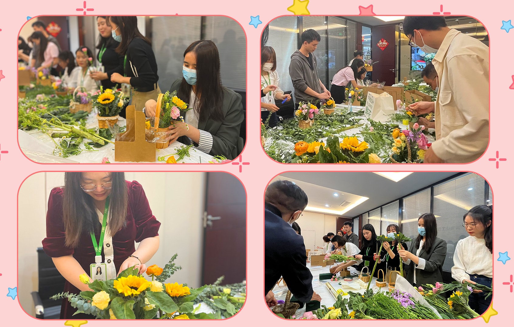 Some of the POE teams are invited to some people in the POE team. People with flower arrangement experience are guided on the spot. They explain the basic skills of flower arrangement in unknown language. Explanation was filled with flower mud, and then everyone acted, and the scene was full of spring. They used their dexterous hands, with five kinds of flowers, with branches and leaves, and scratching, and combined with different colors and shapes to form a unique and deep flower arrangement work. After the flower arrangement works are completed, everyone holds the flowers and leaves their own beautiful moments.